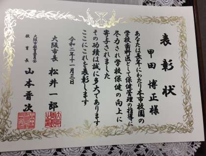 本校 学校歯科医の甲田先生が、表彰を受けられました。