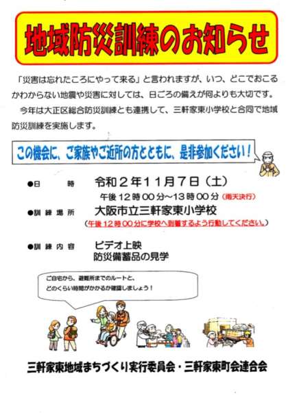 11月7日(土)に、地域防災訓練を行います。今年は、大正区総合防災訓練とも連携して、三軒家東小学校と合同で地域防災訓練を実施します。
