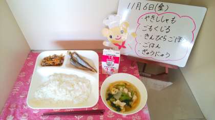 今日の給食は、焼きししゃも、五目汁、きんぴらごぼう、ごはん、牛乳です。