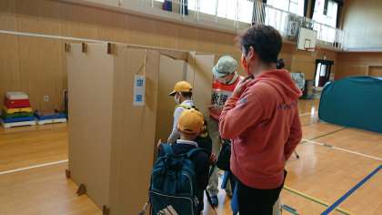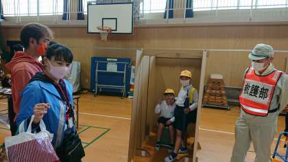 保護者への引き渡し訓練を行いました。その後、体育館で町会ごとの受付を済ませ、備蓄の水をもらって展示等を見て、解散します。