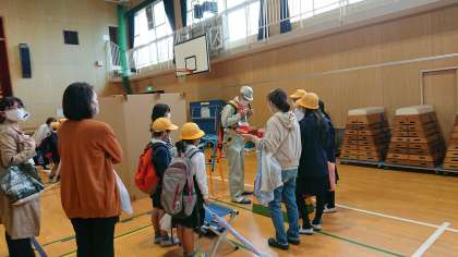 保護者への引き渡し訓練を行いました。その後、体育館で町会ごとの受付を済ませ、備蓄の水をもらって展示等を見て、解散します。