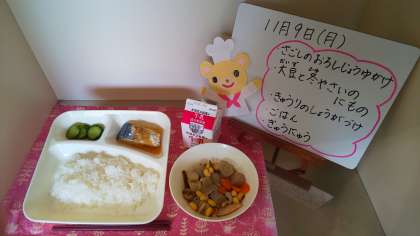 今日の給食は、さごしのおろしじょうゆかけ、大豆と冬野菜の煮もの、きゅうりのしょうがづけ、ごはん、牛乳です。