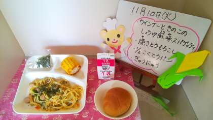 今日の給食は、ウインナーときのこのしょうゆ風味スパゲッティ、焼きとうもろこし、2分の1黒糖パン、牛乳です。