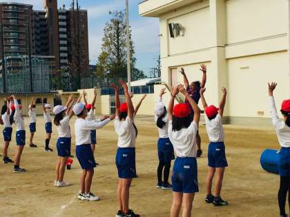 代表児童があいさつをした後、「あべのハルカス」体操を教えていただきました。「あべの〜ハルカス」と大きな声を出しながら、大きく背筋を伸ばして体操をしました。