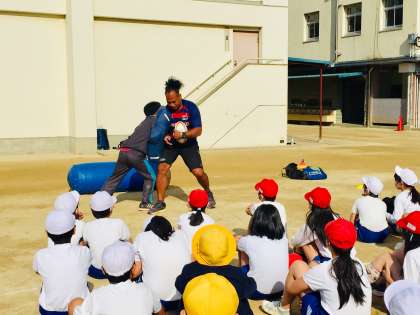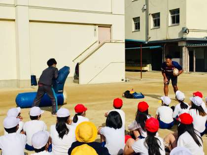 6年生が、元プロ ラガーマン(近鉄ライナーズ)のタウファ統悦さんから、ラグビーを体験させていただきました。タウファさんのタックルに、子どもたちは感銘を受けていました。この活動は、大阪府トップアスリート事業の一環として行っています。