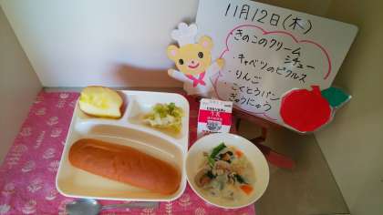 今日の給食は、きのこのクリームシチュー、キャベツのピクルス、りんご、黒糖パン、牛乳です。