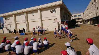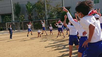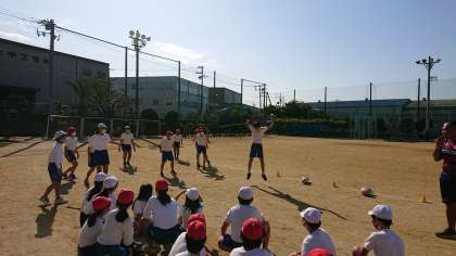 タックルの体験やランニングをしながらのファンゲーム、ボールパスをして体を動かしました。