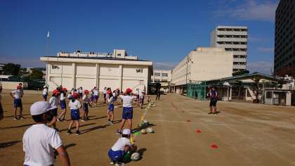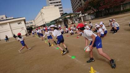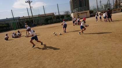 タックルの体験やランニングをしながらのファンゲーム、ボールパスをして体を動かしました。何度も繰り返して作戦タイムを取ることで、チームのコミュニケーションの取り方も学びました。