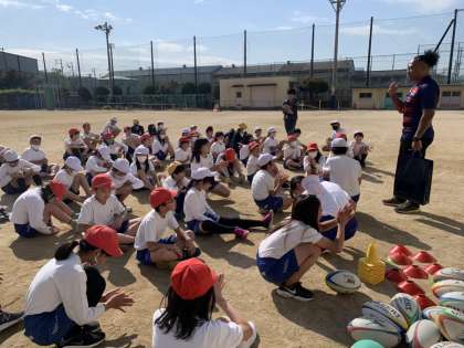 6年生が、元プロ ラガーマン(近鉄ライナーズ)のタウファ統悦さんから、ラグビーを体験させていただきました。最後に質問タイムを設けてくださいました。ラグビーをするきっかけや、ワールドカップに出場してどう感じたが、体を大きくする方法なども答えてくださりました。