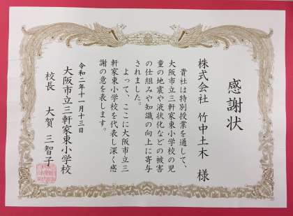 学校長から、(株)竹中土木の方に、感謝状を贈呈致しました。