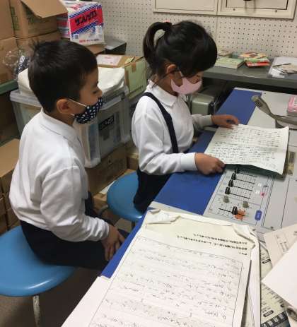 読書週間のしおりと、読書感想文の発表(1年生)の様子です。