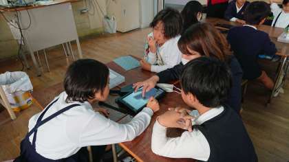 つくった扇風機をタブレットに繋ぎ、プログラムして動かします。
