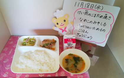 今日の給食は、鶏肉のごまだれ焼き、なめこのみそ汁、キャベツのいためもの、ごはん、牛乳です。