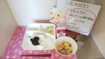 今日の給食は、関東煮、はくさいの甘酢あえ、のりのつくだ煮、ごはん、牛乳です。