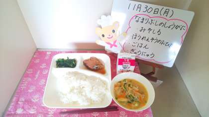 今日の給食は、なまりぶしのしょうが煮、みそ汁、ほうれんそうのおひたし、ごはん、牛乳です。