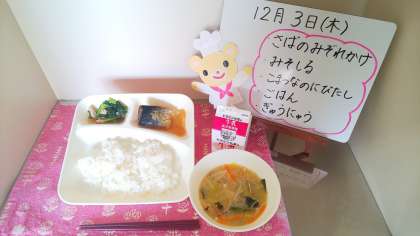 今日の給食は、さばのみぞれかけ、みそ汁、こまつなの煮びたし、ごはん、牛乳です。