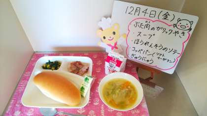 今日の給食は、豚肉のガーリック焼き、スープ、ほうれんそうのソテー、コッペパン(ソフトマーガリン)、牛乳です。