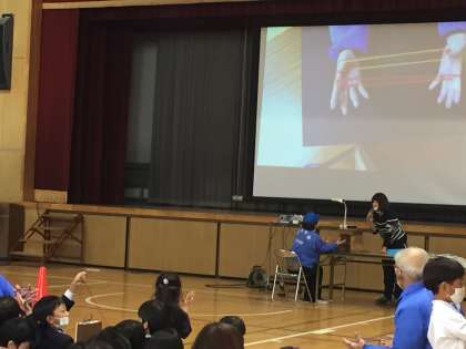 前半の高学年の部では、クイズ大会をしました。後半の低学年の部では、みまもり隊の塩崎さんから、「あやとり」を教えていただきました。