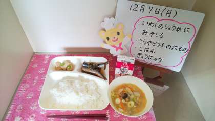 今日の給食は、いわしのしょうが煮、みそ汁、高野どうふの煮もの、ごはん、牛乳です。