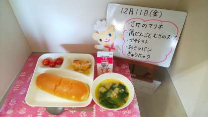 今日の給食は、さけのマリネ、肉だんごと麦のスープ、プチトマト、おさつパン、牛乳です。