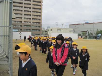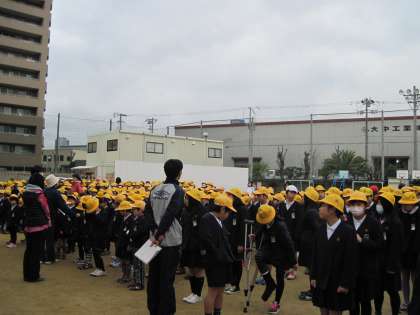 今日は、地震に伴う津波を想定した避難訓練をしました。まず、地震発生ということで運動場に避難しました。工事中ということもあり、低学年は運動場まで少し距離があるのですが、全員が整列し、人数確認終了まで5分11秒でした。学校長のお話を聞き、そこから、津波発生を想定し、お隣のキングマンションのご協力を得て、4階、5階への非難を開始しました。5・6年生が5階、1〜4年生は4階まで避難し、廊下に整列しました。全員が避難完了するまで、運動場を出発してから10分あまりでした。落ち着いて静かに素早く避難できました。キングマンションの方々PTAの方々のご協力に感謝いたします。