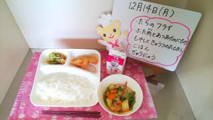 今日の給食は、たらのフライ、豚肉とあつあげの煮もの、もやしときゅうりのおひたし、ごはん、牛乳です。