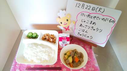 今日の給食は、鶏肉と野菜の煮もの、じゃこ豆、あっさりきゅうり、ごはん、牛乳です。