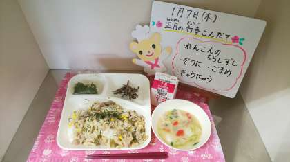 今日の給食は、れんこんのちらしずし、ぞう煮、ごまめ、牛乳です。