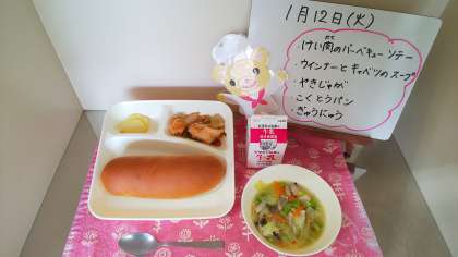 今日の給食は、鶏肉のバーベキューソテー、ウインナーとキャベツのスープ、焼きじゃが、黒糖パン、牛乳です。