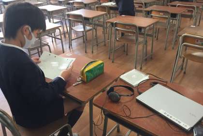 今日は、大阪市学力経年調査の予備日でした。異学年の児童が同じ教室で国語の聞き取りに取り組むために、パソコンとイヤホンを活用しました。一人ひとりの学力を大切に調査しました。