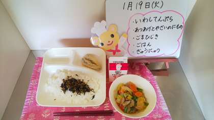 今日の給食は、いわしてんぷら、あつあげと野菜の煮もの、ごまひじき、ごはん、牛乳です。