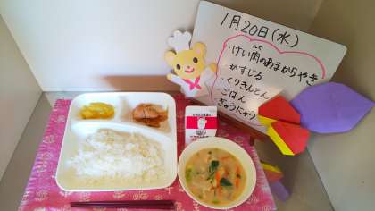 今日の給食は、鶏肉の甘辛焼き、かす汁、くりきんとん、ごはん、牛乳です。