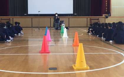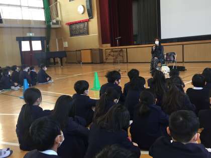 3時間目は、3年生が浅井さんから学んでいます。盲導犬のことや、盲導犬ビビッドくんとの生活についてのお話を聞いています。信号を守ることの大切さや、声のかけ方(ひとりごと)について学んでいます。