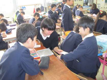 児童会の縦割り班での思い出づくり活動として、児童集会で「カルタ大会」を行います。集会に向けて、縦割り班でかるた作りをしました。みんなで協力してすてきなかるたが出来上がりました。