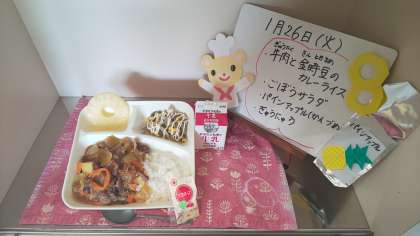 今日の給食は、牛肉と金時豆のカレーライス(近江牛)、ごぼうサラダ、パインアップル(缶詰)、牛乳です。