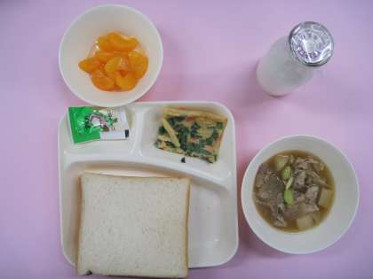 今日の献立は「豚肉とだいこんの煮もの、チヂミ、みかん(缶詰)」でした。