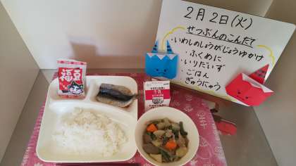 今日の給食は、節分の行事献立です。献立は、いわしのしょうがじょうゆかけ、含め煮、いり大豆、ごはん、牛乳です。