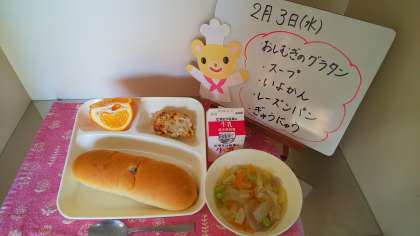 今日の献立は、押麦のグラタン、スープ、いよかん。レーズンパン、牛乳です。