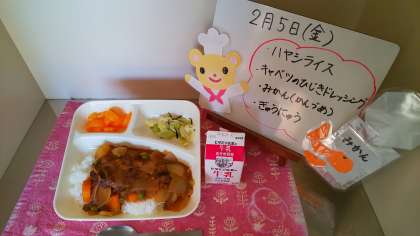 今日の給食は、ハヤシライス、キャベツのひじきドレッシング、みかん(かんづめ)、牛乳です。