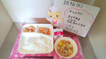 今日の給食は、関東煮、甘酢あえ、白花豆の煮もの、ごはん、牛乳です。
