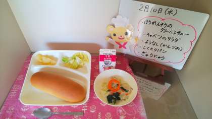 今日の給食は、ほうれんそうのクリームシチュー、キャベツのサラダ、洋なし(かんづめ)、黒糖パン、牛乳です。