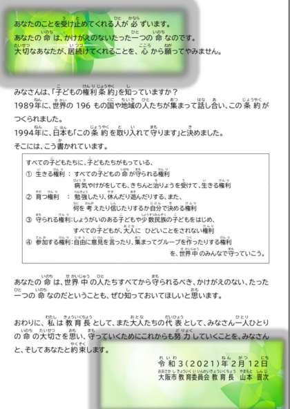 2月12日(金)かけがえのない 大切な存在である 子どもたちへ〜教育長からのメッセージ〜