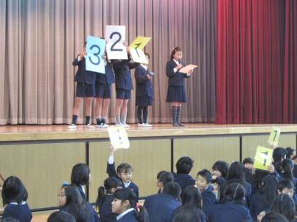 先週の児童集会は、「3択クイズ」でした。縦割り班の友達と相談して、楽しそうに答えていました。その後、班ごとに記念撮影をしました。