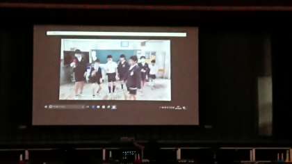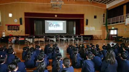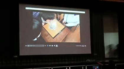 クラブ発表会と卒業を祝う会を2部制で行います。まずは、「昔遊びクラブ」のビデオ発表です。