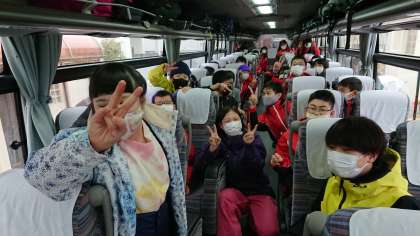 念願の卒業遠足に出発しました。雨ですが、みんな元気です。