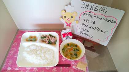 今日の給食は、豚肉と野菜のいためもの、すまし汁、きな粉よもぎだんご、ごはん、牛乳です。