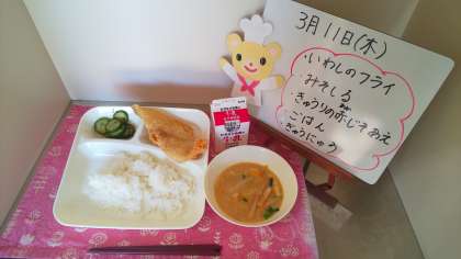 今日の給食は、いわしのフライ、みそ汁、きゅうりの赤じそあえ、ごはん、牛乳です。