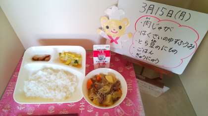 今日の給食は、肉じゃが、はくさいのゆず風味、とら豆の煮もの、ごはん、牛乳です。