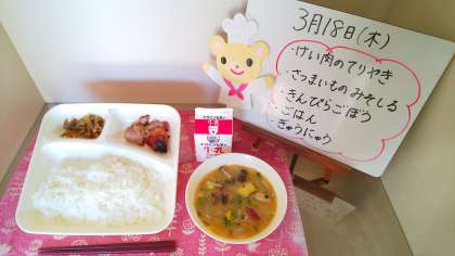 今日の給食は、鶏肉のてり焼き、さつまいものみそ汁、きんぴらごぼう、ごはん、牛乳です。