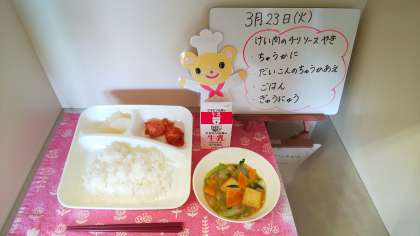 今日の給食は、鶏肉のチリソース焼き、中華煮、だいこんの中華あえ、ごはん、牛乳です。